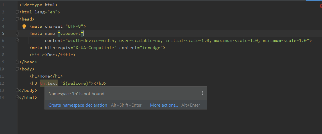 : hover 했을 때 나오는 Create namespace declaration을 클릭해주면, 윗부분에 xmlns:th="http://www.w3.org/1999/xhtml" 이 추가가 된다.